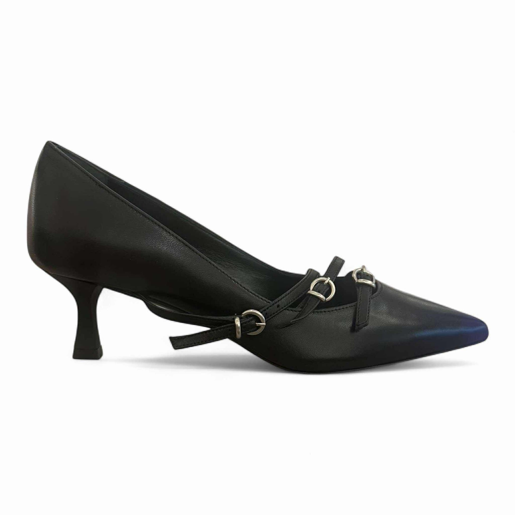 Elegante décolleté in pelle nera con punta affusolata e tacco basso a rocchetto. Il design è impreziosito da dettagli con cinturini intrecciati e mini fibbie metalliche, che aggiungono un tocco sofisticato e moderno. Perfetta per look da ufficio o occasioni formali, unisce stile e comfort grazie alla calzata stabile e al tacco contenuto.