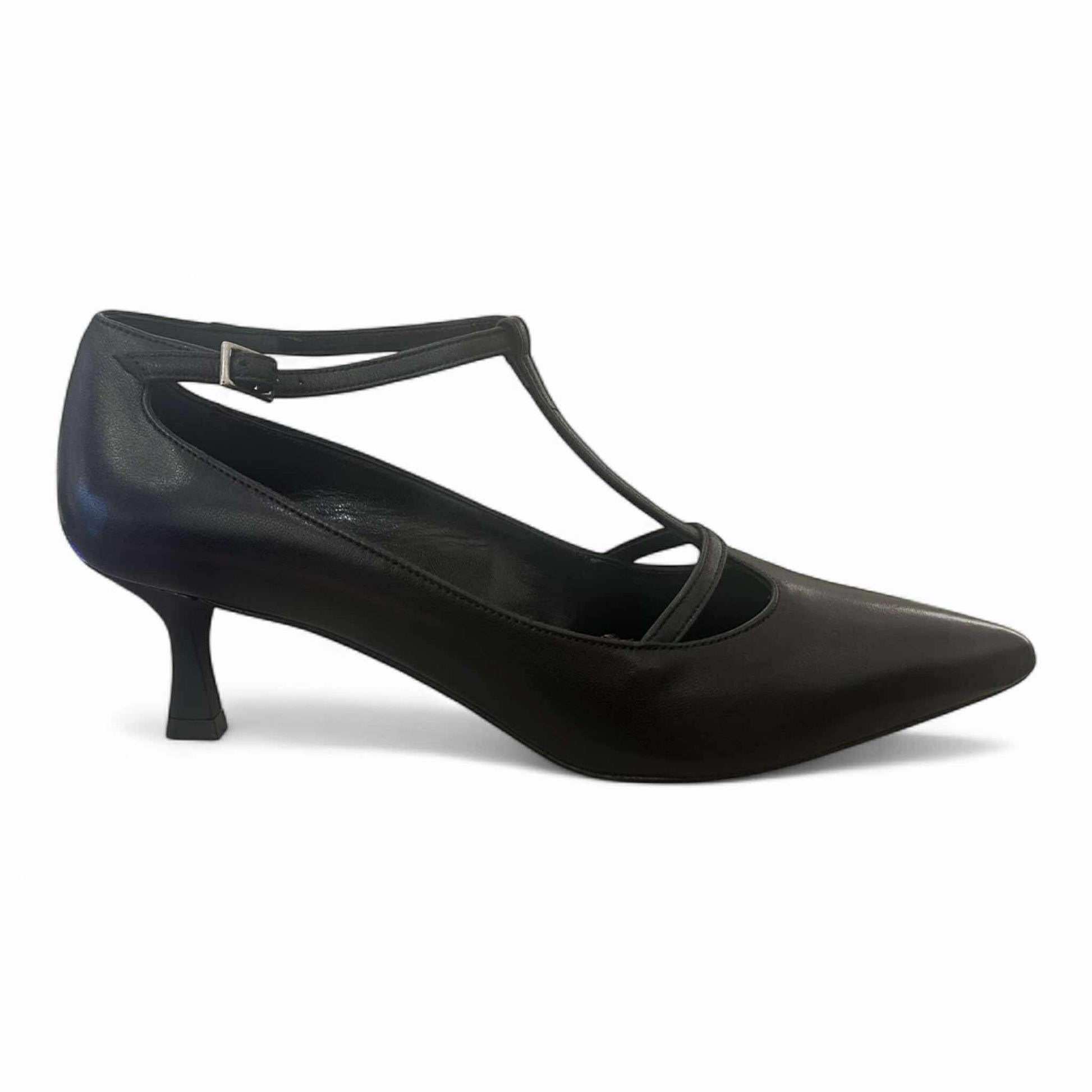 Décolleté in pelle nera con elegante cinturino a T e chiusura alla caviglia con fibbia. Design raffinato con punta affusolata e tacco basso a rocchetto per un perfetto equilibrio tra stile e comfort. Ideale per occasioni formali o per aggiungere un tocco sofisticato al look quotidiano.