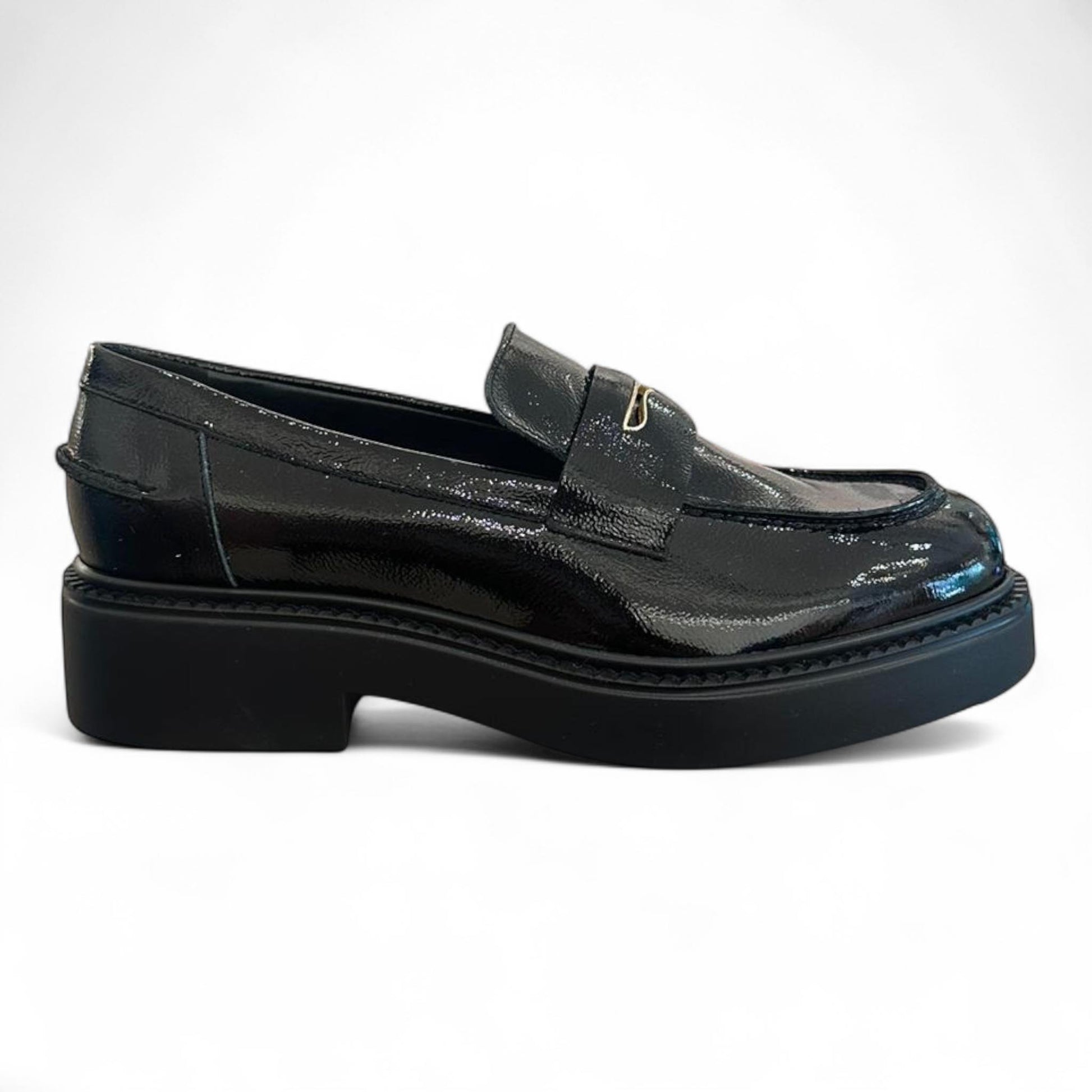 Questa scarpa è un mocassino dallo stile elegante e moderno. È realizzata in pelle verniciata nera, con una finitura lucida che le conferisce un aspetto sofisticato. La suola è spessa e piatta, in gomma nera, con un leggero rialzo per un tocco contemporaneo. Sul davanti presenta una fascetta con un piccolo dettaglio metallico dorato, tipico del design dei mocassini classici ma rivisitato in chiave attuale.